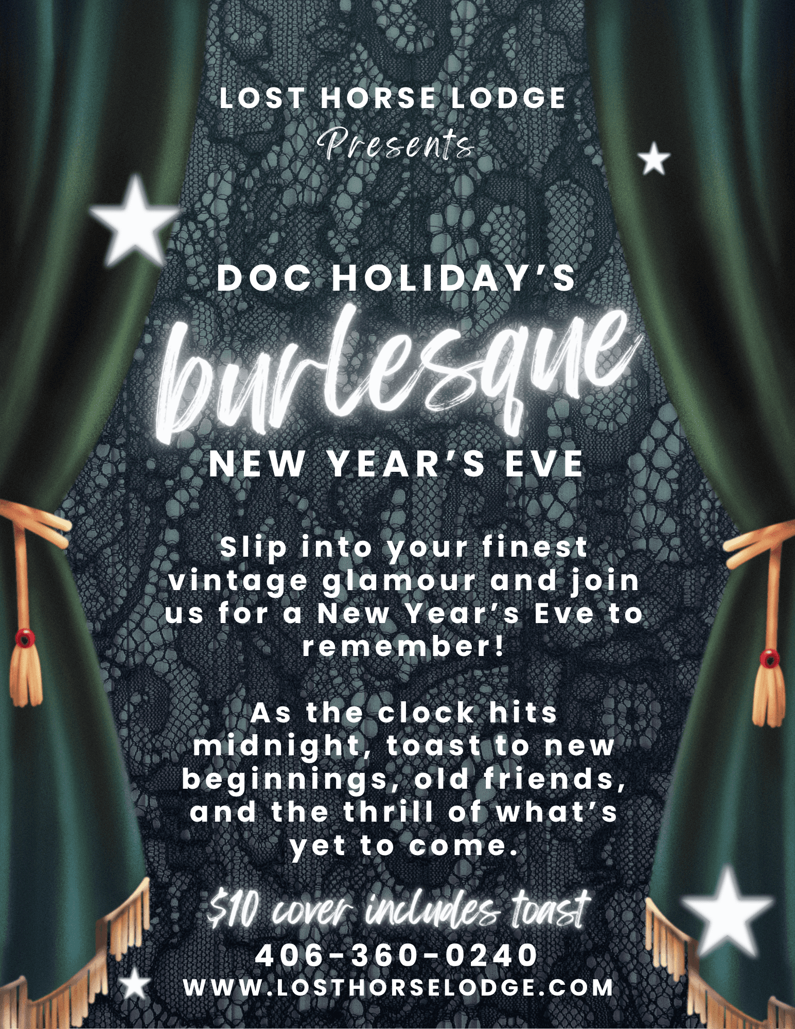 Saddle up for a night of intrigue and indulgence at the lodge as we ring in the New Year, Doc Holiday–style. Step into the gilded glow of the Old West with a burlesque twist — think velvet, lace, and a dash of mischief. Dress to the nines in your finest vintage glamour or dapper saloon attire and dance the night away beneath twinkling lights and champagne dreams.