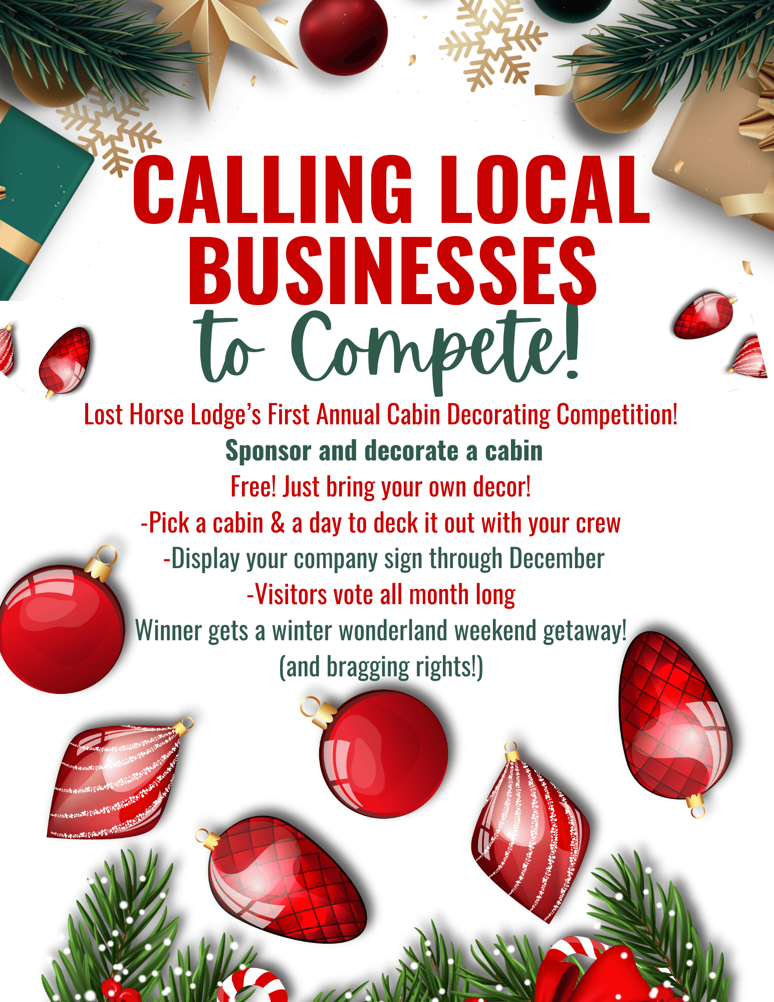It's FREE! Local business are invited to sponsor one of our studio cabins and decorate the exterior to display the month of December! Select your cabin, pick a day to deck it out with your team, and display your company signage proudly! Visitors will enjoy strolling our little Lost Horse Christmas Tree Lane until the New Year and vote for their favorite creation!